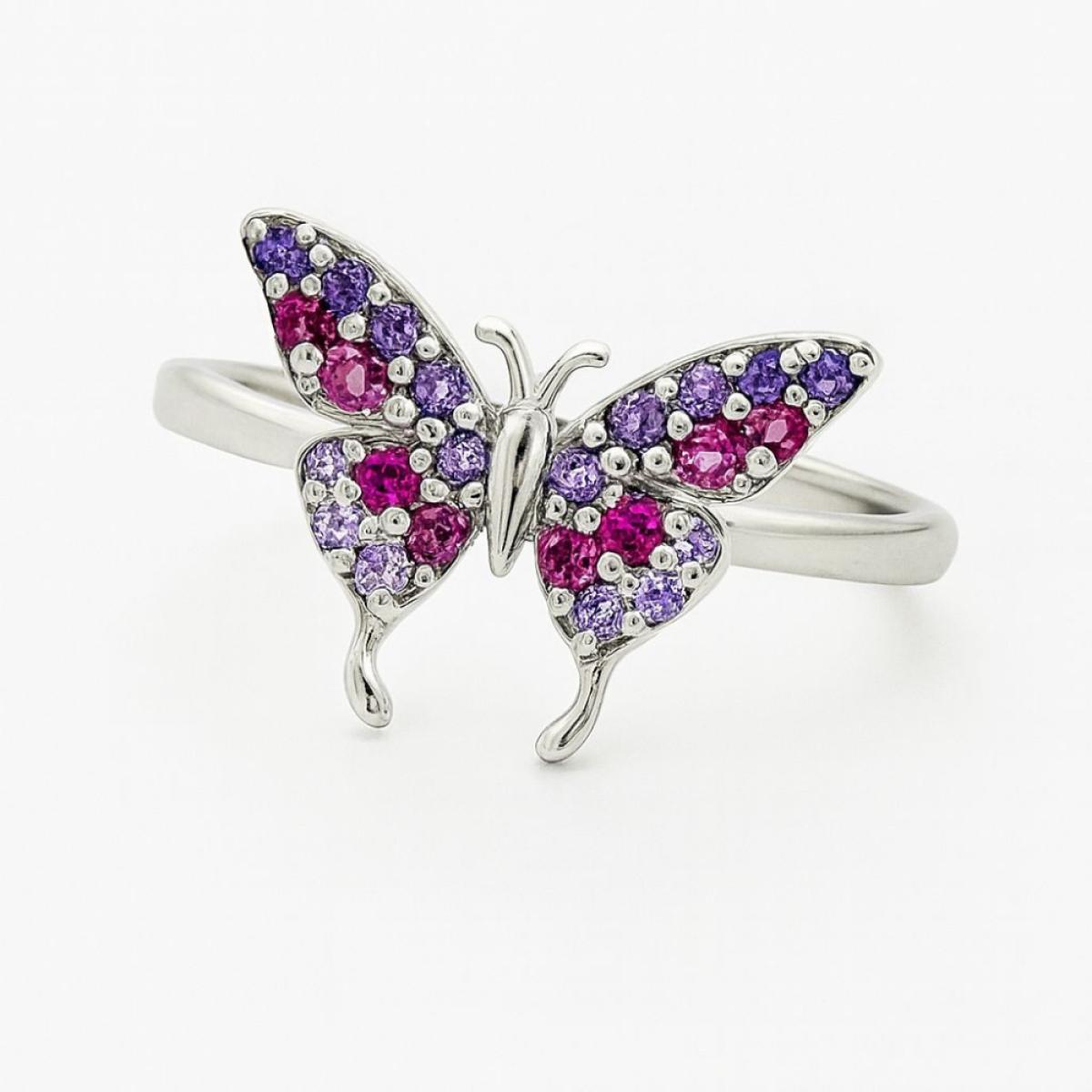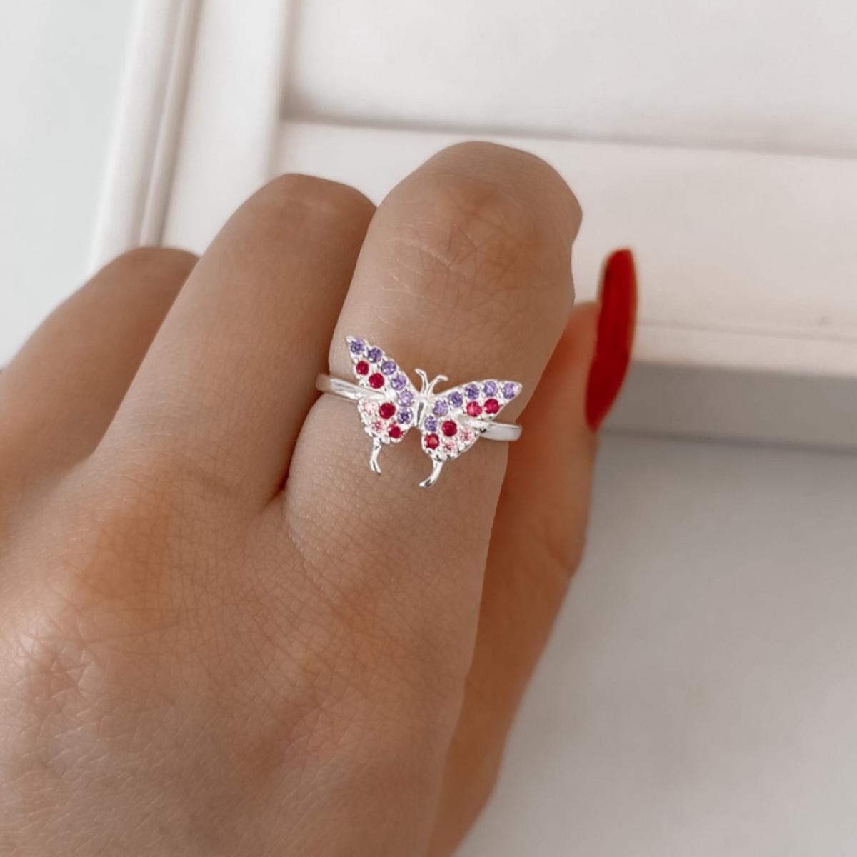 Anel em Prata 925 legítima, com aro delicado e design encantador em formato de borboleta, símbolo de liberdade e transformação. As asas são cravejadas com zircônias coloridas em tons vibrantes, que garantem brilho e alegria à peça. Uma joia cheia de vida, perfeita para quem gosta de acessórios delicados, modernos e cheios de significado.