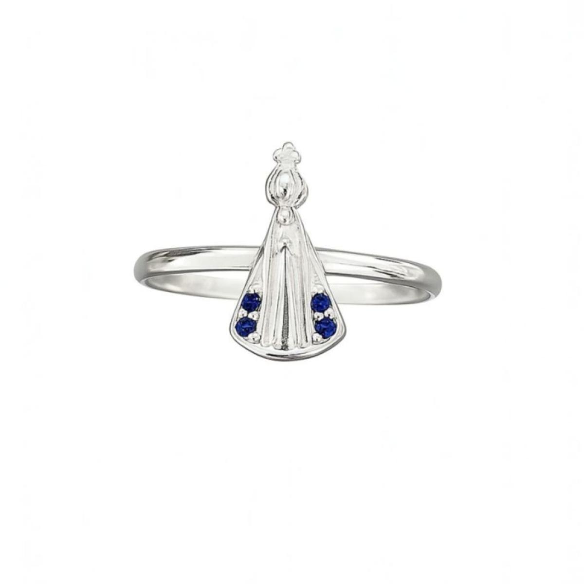 Anel em Prata 925 legítima, com garantia eterna da prata, desenvolvido em um design especial que traz a imagem da Nossa Senhora Aparecida como símbolo de fé e devoção. A peça é delicadamente cravejada com pedras de zircônia, que proporcionam brilho sofisticado e elegante.