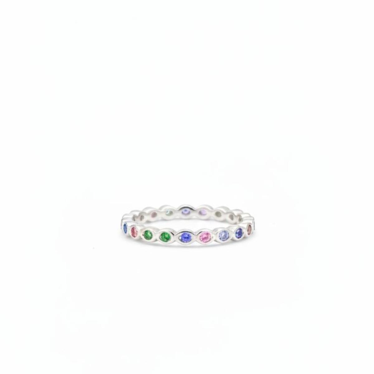 Anel em Prata 925 legítima, com aro delicado e design central em formato de símbolo infinito, representando eternidade, amor e equilíbrio. O destaque fica por conta das zircônias coloridas cravejadas ao longo do símbolo, que proporcionam brilho vibrante e alegre, tornando a peça única e cheia de personalidade. Uma joia moderna e significativa, ideal para quem gosta de acessórios marcantes e cheios de estilo.