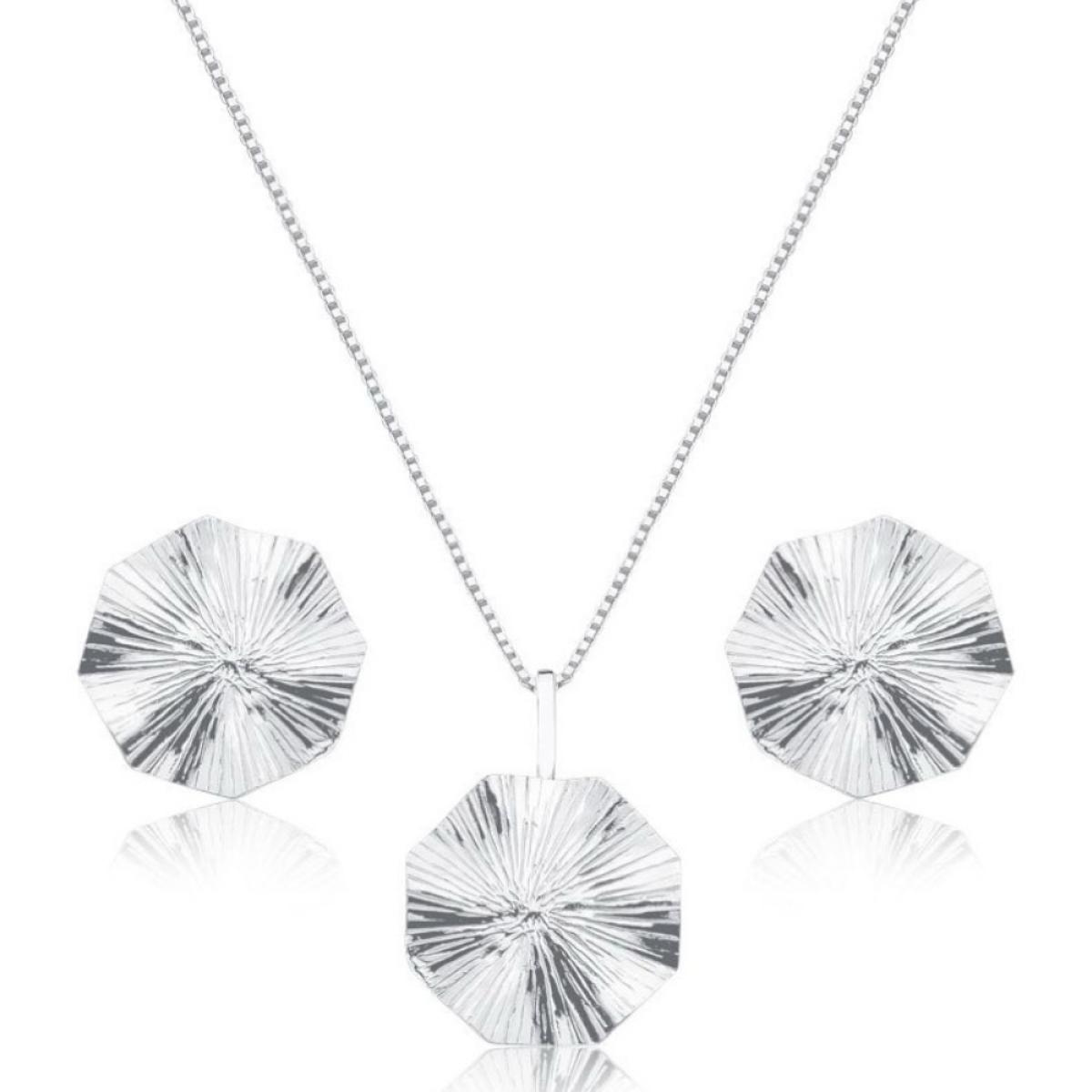 Conjunto em Prata 925 legítima, composto por colar e par de brincos com design redondo orgânico, trazendo formas suaves e irregulares que remetem à fluidez da natureza. O acabamento liso e polido garante brilho sofisticado, enquanto o estilo minimalista e moderno proporciona versatilidade para combinar com diferentes looks, do casual ao elegante.
