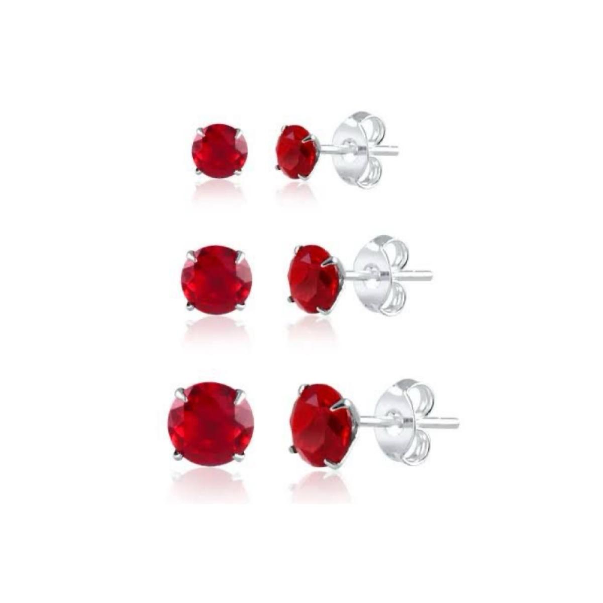 Trio de brincos em Prata 925 legítima, no estilo clássico ponto de luz redondo, com zircônias na cor vermelha que refletem brilho intenso e marcante. O conjunto traz três tamanhos diferentes, proporcionando versatilidade — ideal para quem tem múltiplos furos ou deseja variar o look em diferentes ocasiões. Uma joia sofisticada e atemporal, que transmite elegância e personalidade.