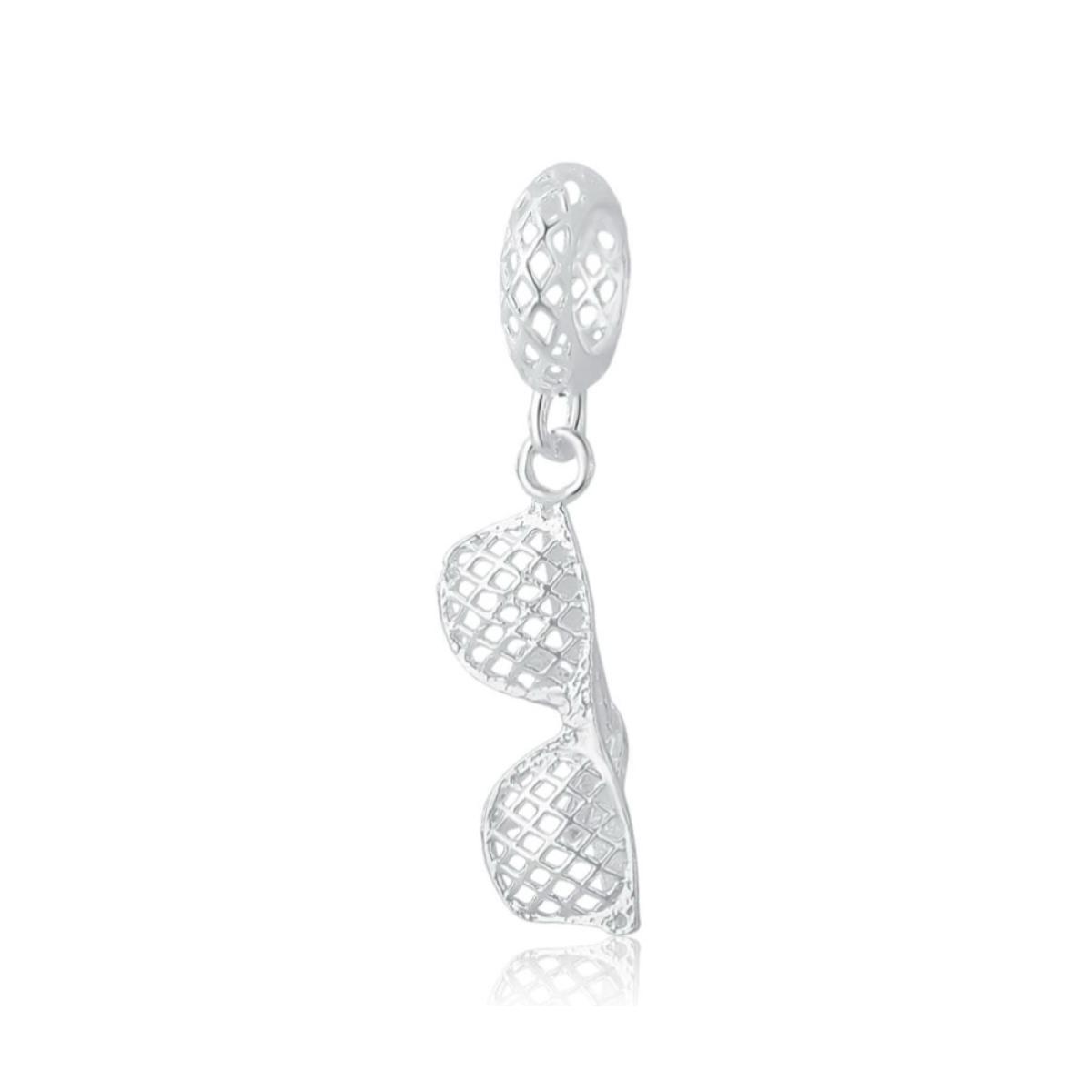 Berloque em Prata 925 legítima, em formato de óculos estilizado vazado, moderno e descontraído, perfeito para quem ama moda, estilo e acessórios criativos. Uma peça divertida e cheia de personalidade, ideal para personalizar pulseiras e representar paixão por viagens, praia, verão ou simplesmente pelo lifestyle descolado.