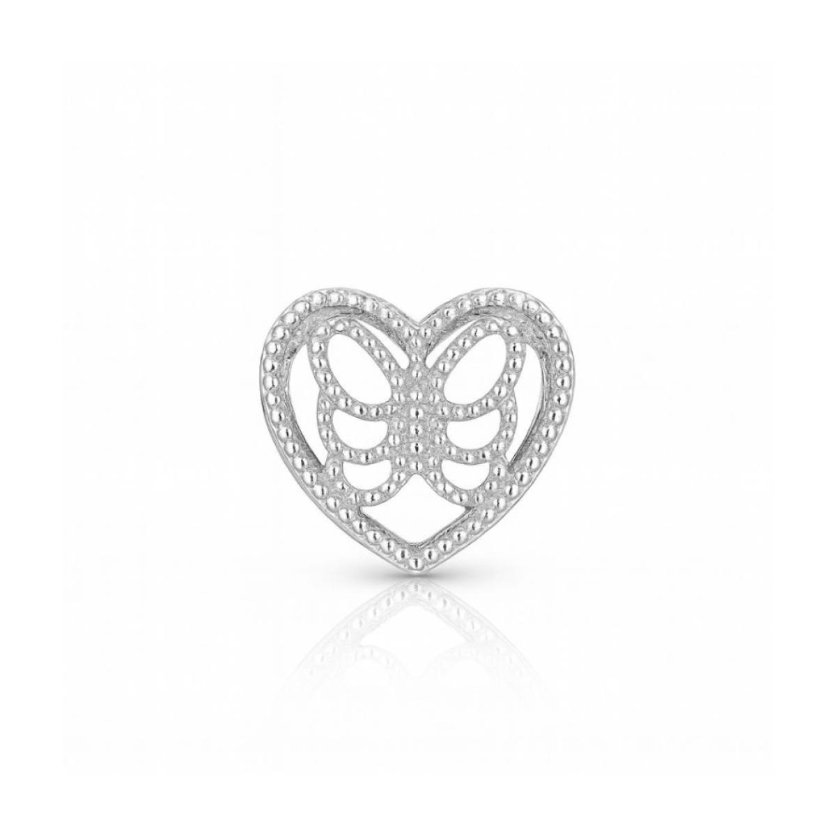 Berloque separador em Prata 925 legítima, com design encantador de coração vazado, adornado por uma delicada borboleta, simbolizando amor, leveza e transformação. Uma joia charmosa e cheia de significado, ideal para organizar berloques na pulseira enquanto acrescenta beleza e romantismo à composição.
