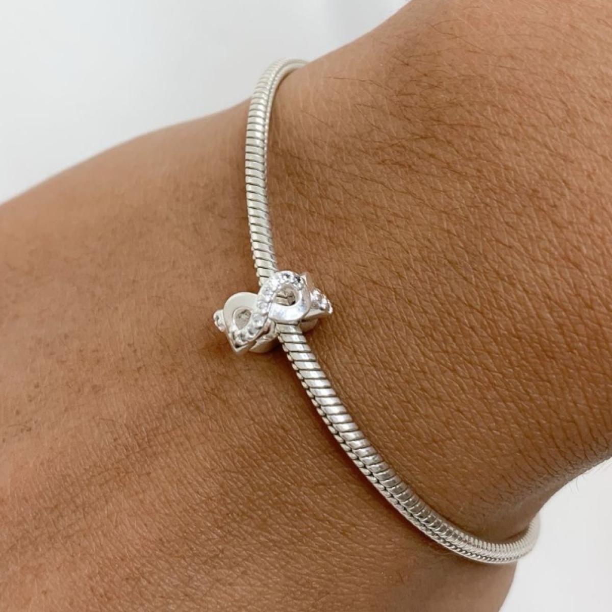 Berloque separador em Prata 925 legítima, com design do símbolo do infinito, representando eternidade, amor sem fim e conexões infinitas. Uma joia delicada e significativa, ideal para organizar berloques na pulseira, trazendo elegância e um toque especial cheio de simbolismo.