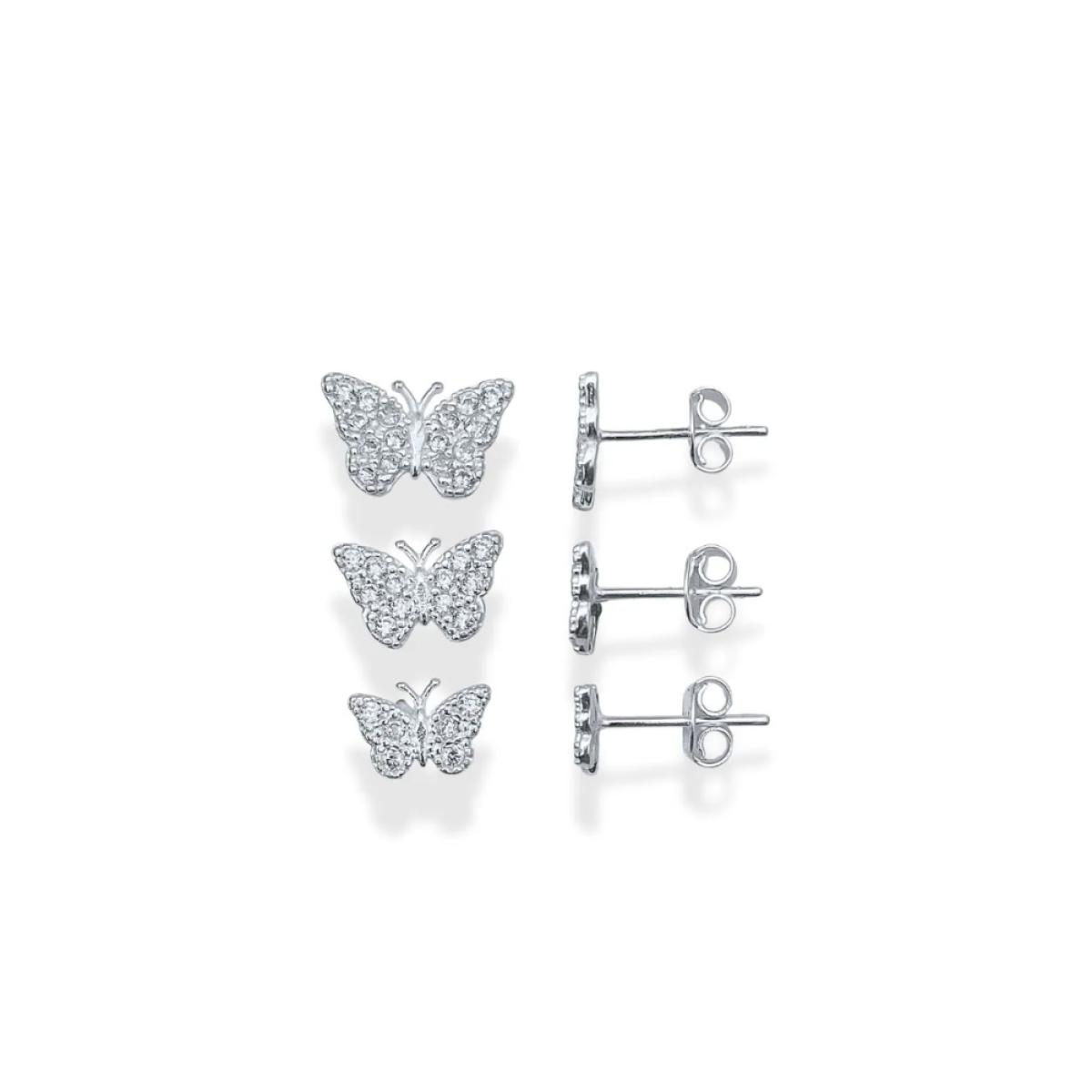 Trio de brincos em Prata 925 legítima, com delicado design de borboletas detalhadas, que simbolizam leveza, transformação e liberdade. O conjunto é composto por três tamanhos diferentes, perfeitos para quem possui múltiplos furos ou gosta de variar o estilo no dia a dia. O acabamento polido realça cada detalhe das asas, tornando a peça charmosa, moderna e atemporal.
