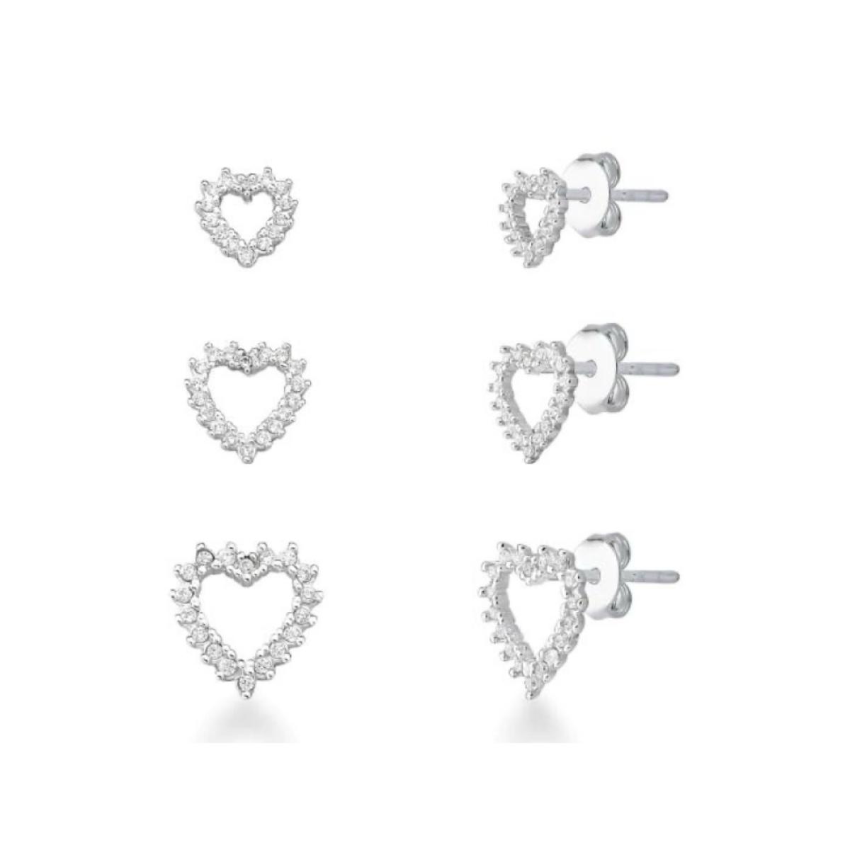 Trio de brincos em Prata 925 legítima, com design delicado de corações vazados, totalmente cravejados com zircônias cristal, que proporcionam brilho intenso e sofisticado. O conjunto conta com três tamanhos diferentes, ideal para quem possui múltiplos furos ou deseja variar os acessórios no dia a dia. Uma joia romântica, elegante e versátil, perfeita para compor produções delicadas e também para presentear.